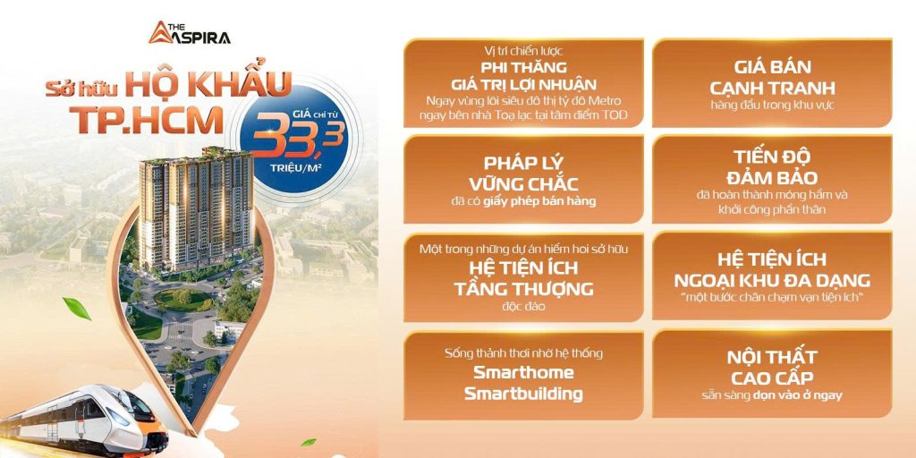 Trong khi đó, các dự án tại Thủ Đức có giá trung bình từ 55–85 triệu/m². Chính mức giá “mềm” cùng tiềm năng tăng trưởng cao đã giúp The Aspira trở thành điểm đến ưa chuộng của giới đầu tư “đón đầu sóng hạ tầng”.