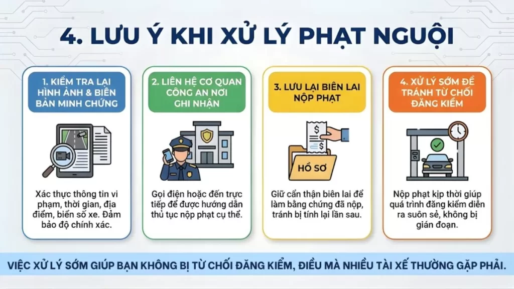 Phần quan trọng nhất không phải là “tra ra hay không”, mà là xử lý đúng khi đã có kết quả. Nếu thấy vi phạm, bạn nên chụp màn hình hoặc lưu lại thông tin hiển thị (thời gian, địa điểm, lỗi, đơn vị xử lý). Sau đó, bạn liên hệ hoặc làm việc theo hướng dẫn của cơ quan xử lý được nêu trong thông báo/phiếu (nếu có). Khi đi giải quyết, thường bạn cần mang theo giấy tờ cá nhân, giấy tờ xe và các giấy tờ liên quan theo yêu cầu. Sau khi hoàn tất nghĩa vụ nộp phạt, bạn nên giữ lại biên lai để đối chiếu về sau, đồng thời kiểm tra lại trạng thái trên hệ thống sau một khoảng thời gian cập nhật, tránh trường hợp đã xử lý nhưng cảnh báo vẫn còn do chưa đồng bộ kịp.